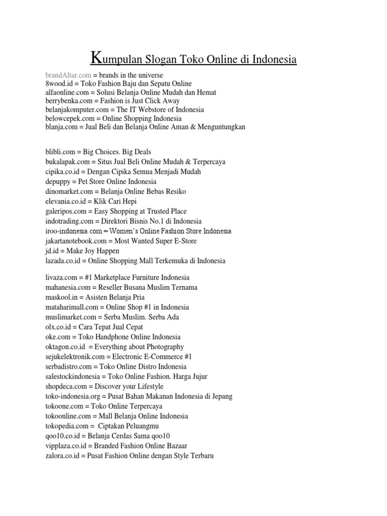 Kumpulan Slogan Atau Tagline Toko Online Indonesia Pdf Trade Retailing from imgv2-1-f.scribdassets.com Peluang yang sangat mengiurkan jika berbisnis online. Oct 19, 2016 · sebagai contoh bisnis online jualan baju lewat facebook, binsin online membuat blog, bisnis online melalui twitter dan lain sebagainya. Ratakan merupakan marketplace digital terlengkap serta jaringan afiliasi produk digital, ecourse, jasa digital, dan event. Nov 10, 2018 · dari sekian banyak ide bisnis online, berjualan kosmetik dan baju atau fashion lainnya merupakan salah satu usaha komersial yang tidak akan pernah ada matinya seperti b erl cosmetics. Apr 06, 2021 · memulai bisnis online dengan membuat iklan atau menjadi marketing ataupun dropshipper sangatlah membantu bagi para pemula seperti saya untuk memulai bisnis online tanpa modal, tanpa membuka toko, tanpa membayar karyawan. Antara 1998 dan 2000 banyak bisnis di as dan eropa mengembangkan situs web perdagangan ini. Jun 14, 2021 · viral rekaman aksi seorang suami mengamuk lantara diduga sang istri sering belanja online. Toko offline dan online reseller online grosir murah partai besar